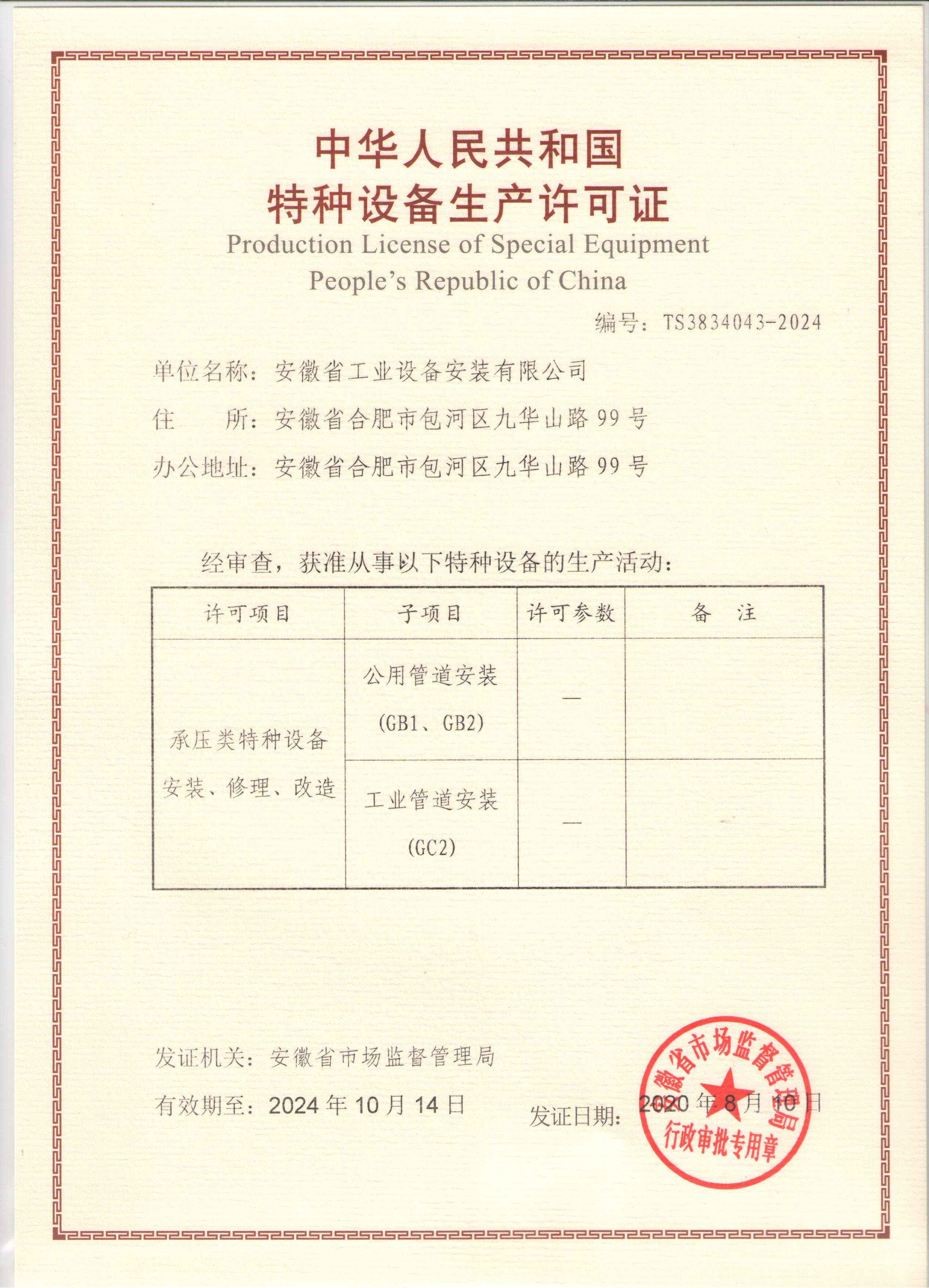 特種設(shè)備安裝改造維修許可證(壓力管道)