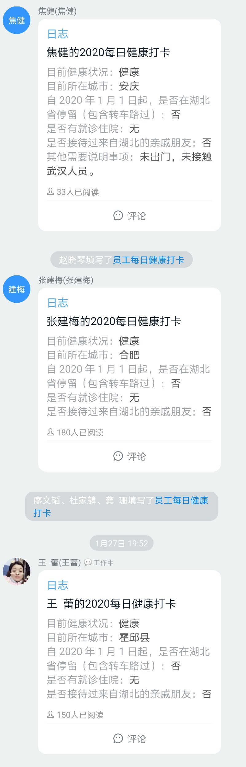 1月27日(大年初三),公司下發《安徽安裝公司關于做好新型冠狀病毒肺炎疫情工作的防控措施》,全體員工每日在釘釘日志專項報告當日去向及身體狀況,各分公司、各部門認真做好登記,確保信息及時準確,時刻密切關注員工的身體健康狀況。
