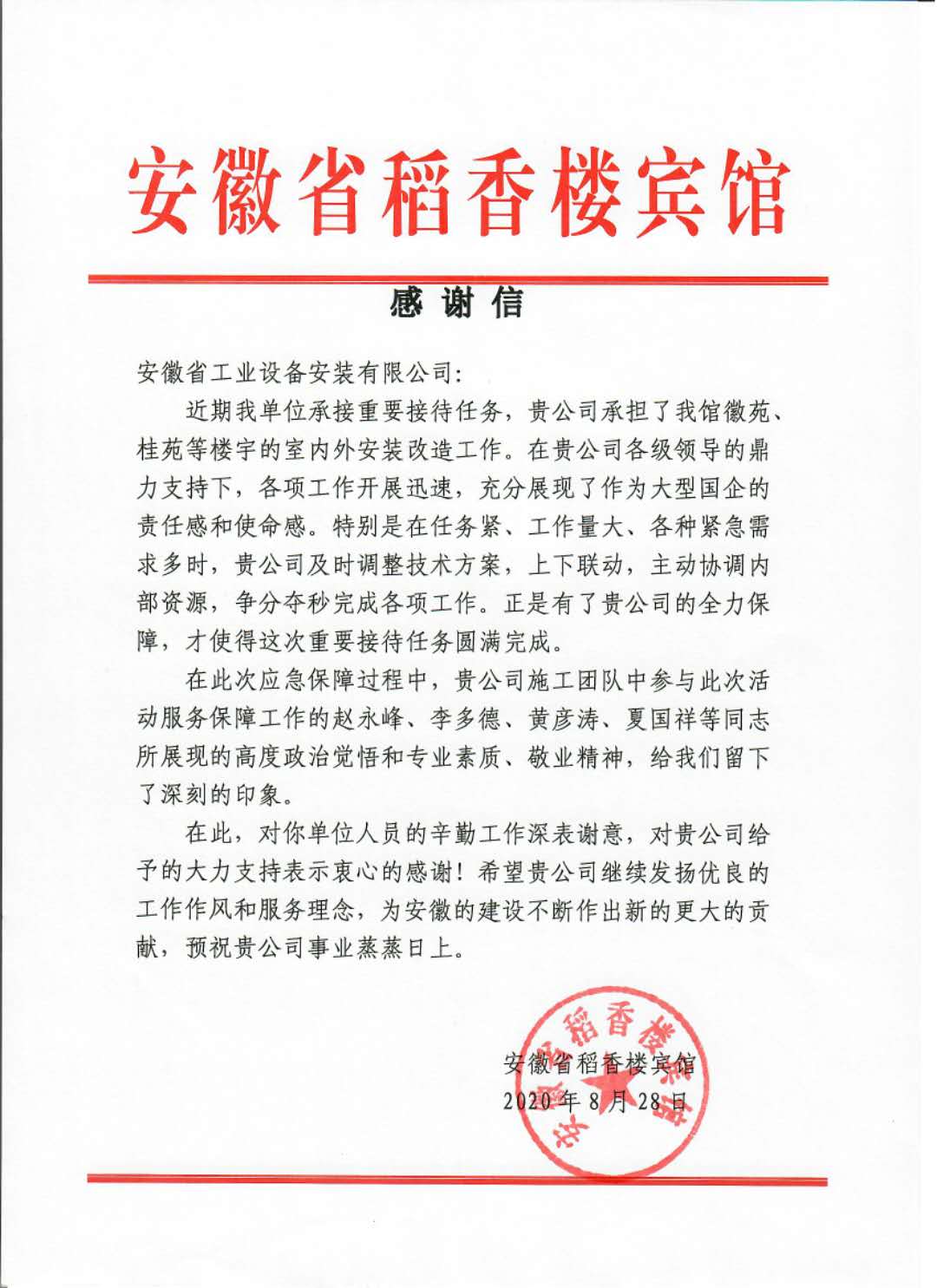 為此,稻香樓賓館發來的一封感謝信,感謝安徽安裝公司在近期承擔的稻香樓賓館室內外安裝改造工程任務中,啟動迅速、保障有力、方案得當、上下聯動;通過日夜搶工奮戰,爭分奪秒地完成各項工作,充分發揮國企擔當的重任。