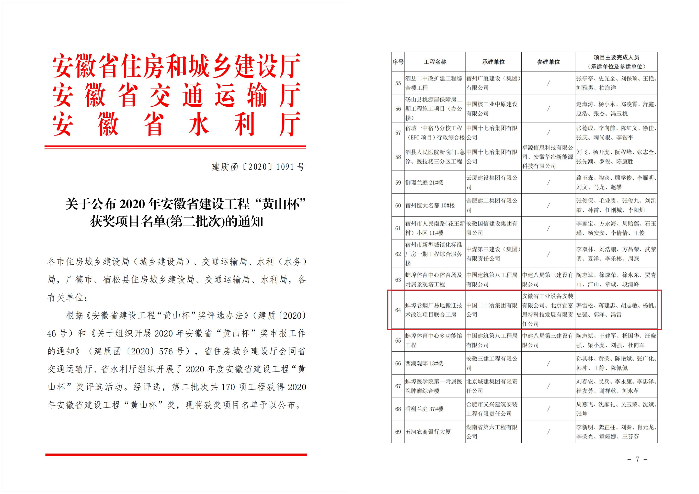 12月14日,經(jīng)安徽省住房城鄉(xiāng)建設廳會同省交通運輸廳、省水利廳評選,安徽安裝公司蚌埠卷煙廠易地搬遷技術改造項目聯(lián)合工房等機電安裝工程榮獲“黃山杯”獎。