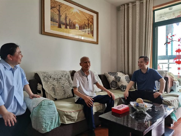 6月30日,黃代來到88歲老黨員胡桂壽家。胡桂壽1949年4月入伍,1956年5月加入中國共產黨,1952年參加抗美援朝戰爭,1965年參加抗美援越戰爭。黃代認真傾聽胡老回顧他難忘的戰斗經歷,一起重溫我們黨百年光輝歷程并親切詢問了胡老的家庭、生活和身體健康情況,代表集團黨委向胡老致以誠摯問候和衷心祝福,對胡老為黨、為人民、為公司默默奉獻,在平凡的崗位上做出的不平凡的貢獻表示衷心的感謝。黃代還向胡老介紹了近年來集團公司的發展變化,希望胡老多建言獻策,齊心協力推動安徽建工高質量發展。