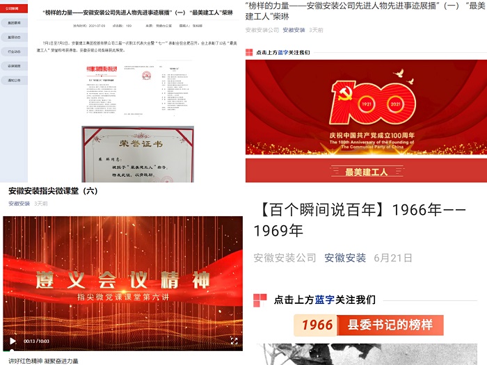 公司黨委第一時間編印??麄靼鍒笙掳l至所屬各單位和基層項目一線,用好企業網站、微信公眾號、電子屏、宣傳欄和所屬各單位、各項目部所有宣傳陣地,在公司網站、微信公眾號先后開設“百個瞬間說百年”“黨史學習教育專欄系列報道”“榜樣的力量——安徽安裝公司先進人物先進事跡展播”“記錄奮進力量—安徽安裝公司基層一線事跡展播”等專欄進行專題宣傳,大力營造“學習黨史有熱情,干事創業有激情”的良好氛圍,合肥分公司黨支部舉辦黨史學習教育主題攝影大賽,努力營造悟初心、守初心、踐初心的強大聲勢。
