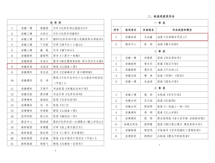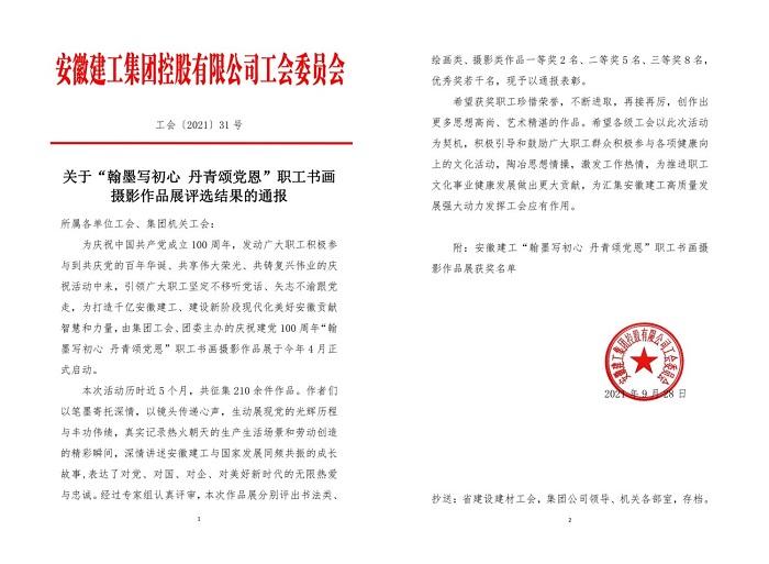 9月29日,集團公司工會通報了“翰墨寫初心 丹青頌黨恩”職工書畫攝影作品展評選結(jié)果,安徽安裝公司選送的五幅作品榜上有名。其中馬金鑫的油畫作品《支部建在項目上》榮獲繪畫類一等獎,任禹豪的攝影作品《幸福是干出來的》榮獲攝影類二等獎,化范寶的硬筆書法作品《沁園春·雪》和程茂麗的攝影作品《攀登》、胡欣欣的攝影作品《齊心》分別榮獲書法類優(yōu)秀獎和攝影類優(yōu)秀獎。