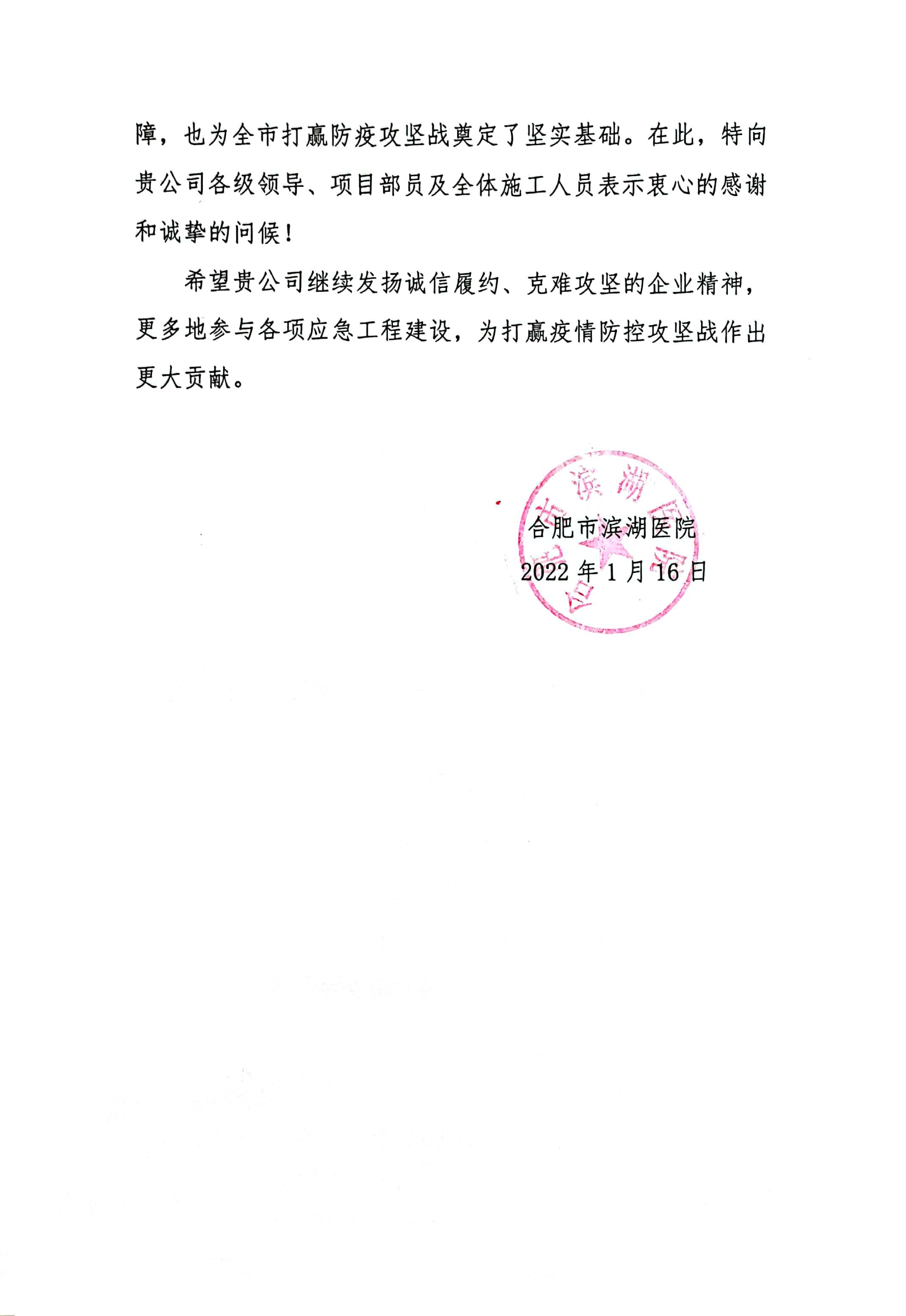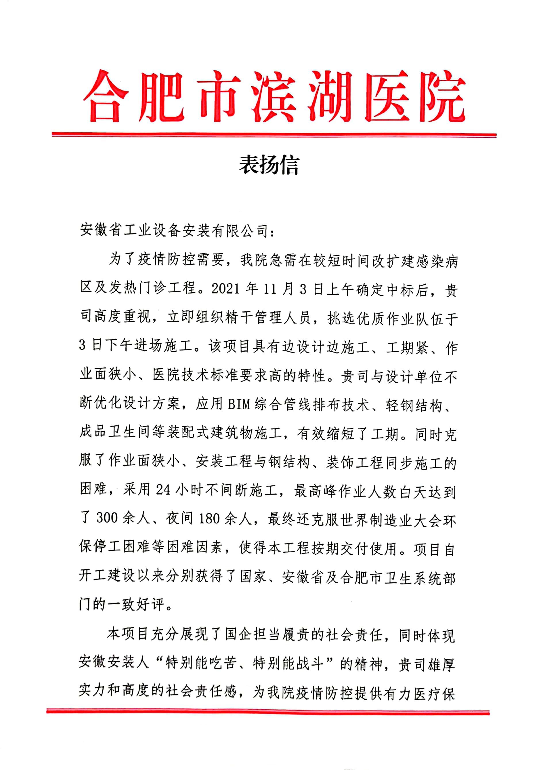 近日,安徽安裝公司收到合肥市濱湖醫院表揚信,信中高度贊揚公司濱湖醫院感染病區及發熱門診應急改造工程設計施工一體化方艙醫院項目克服重重困難,縮短工期,一個月的時間內按期交付使用。該項目充分展現了安徽安裝作為國有企業擔當履責的社會責任,為合肥市打贏防疫攻堅戰奠定了堅實基礎。