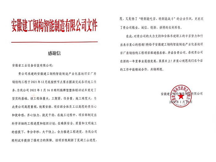 信中表示,安徽建工鋼構智能制造有限公司廠房鋼結構工程自開工以來,科學制定施工生產計劃,項目部全體員工以高度的責任心、使命感,齊心協力,鼓足干勁,在確保安全、質量和文明施工的前提下,爭分奪秒,大干快上,全力推進工程進度。最終在2021年12月底前按照節點要求圓滿完成各項施工任務,為業主單位順利揭牌暨整體聯動試車成功提供了強有力的保障,展現了敬業、誠信、創新、拼搏的良好形象。