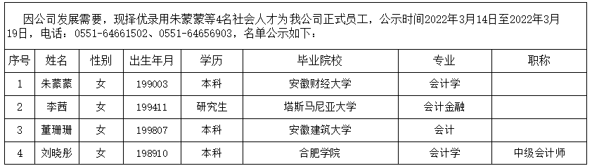 2022年擬錄用社會人才公示