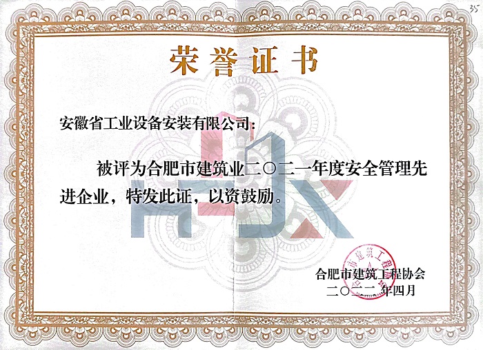 近日,合肥市建筑工程協會傳來喜訊,2021年度合肥市優秀企業、單項先進企業的評選已出爐,安徽安裝再次斬獲“合肥建筑業優秀施工企業”“合肥建筑業安全管理先進企業”榮譽稱號。