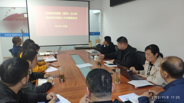 11月9日上午,房建(裝飾)分公司黨支部組織全體黨員、機關干部職工、在肥項目經理召開學習宣貫黨的二十大精神專題會議。會議由支部書記程茂麗主持。