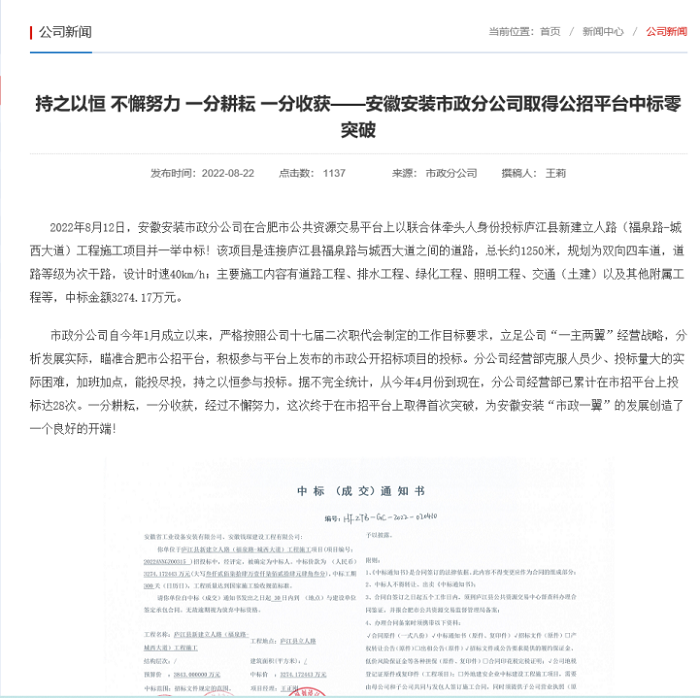 開拓市場(chǎng)取得突破。今年以來(lái),分公司積極采取參與集團(tuán)內(nèi)部產(chǎn)業(yè)鏈專業(yè)分包競(jìng)標(biāo)和外部公招項(xiàng)目投標(biāo)雙向并舉的方式拓展市場(chǎng),打開經(jīng)營(yíng)局面,連續(xù)承接了蜀山區(qū)體育公園項(xiàng)目安裝工程等多個(gè)項(xiàng)目。同時(shí)積極參與合肥市公招平臺(tái)投標(biāo),8月份一舉中標(biāo)廬江縣新建立人路(福泉路-城西大道)工程施工項(xiàng)目,中標(biāo)金額3274.17萬(wàn)元,取得公招投標(biāo)零的突破。